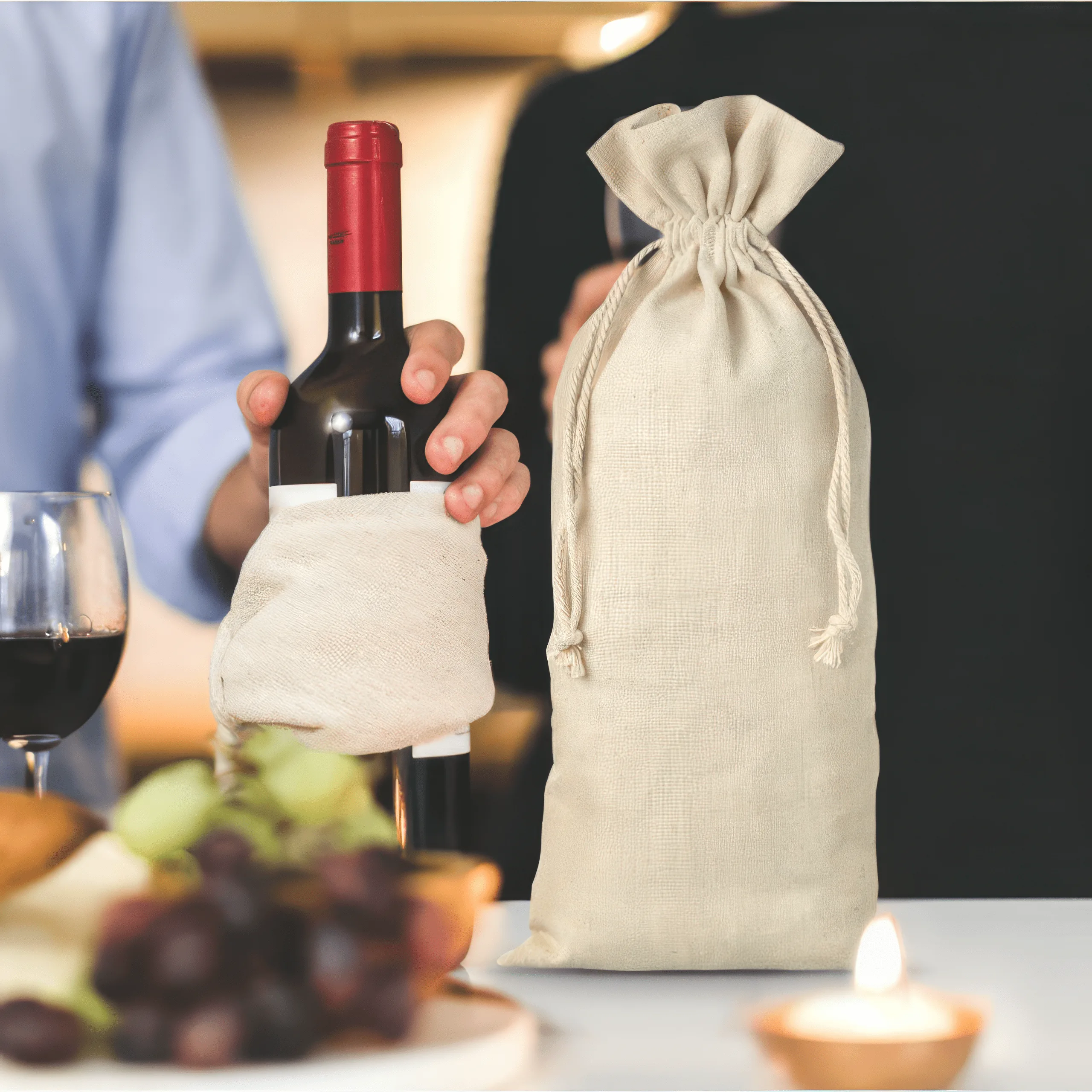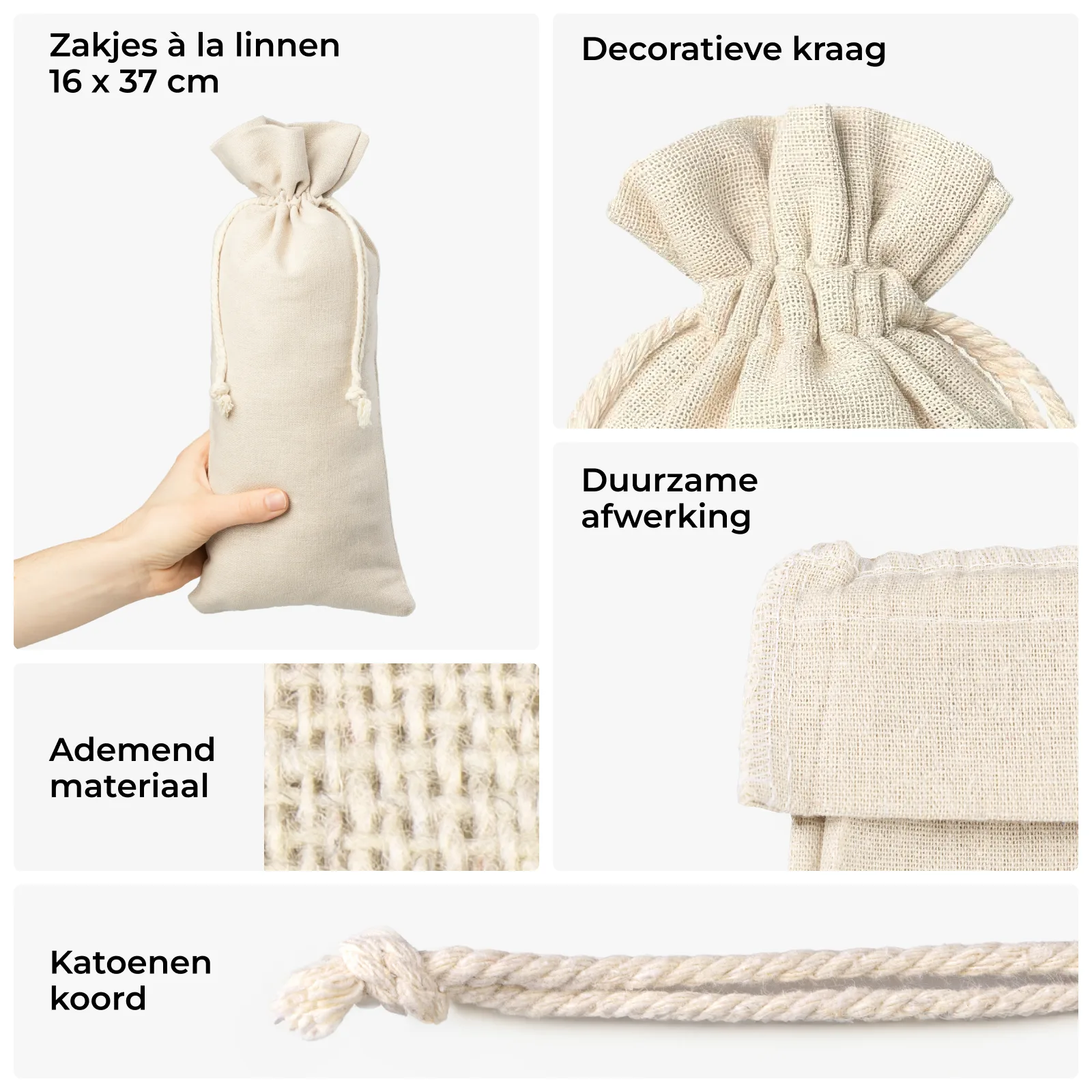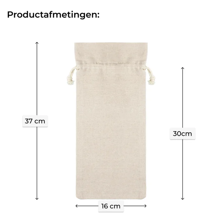 Verpakking voor wijn en alcohol: Onze linnen zakjes van 16 x 37 cm zijn de perfecte oplossing voor stijlvolle flessen wijn of alcohol. Dankzij hun natuurlijke uiterlijk en personalisatiemogelijkheden, zijn ze een uitstekende keuze voor zakelijke en gelegenheidsgeschenken.