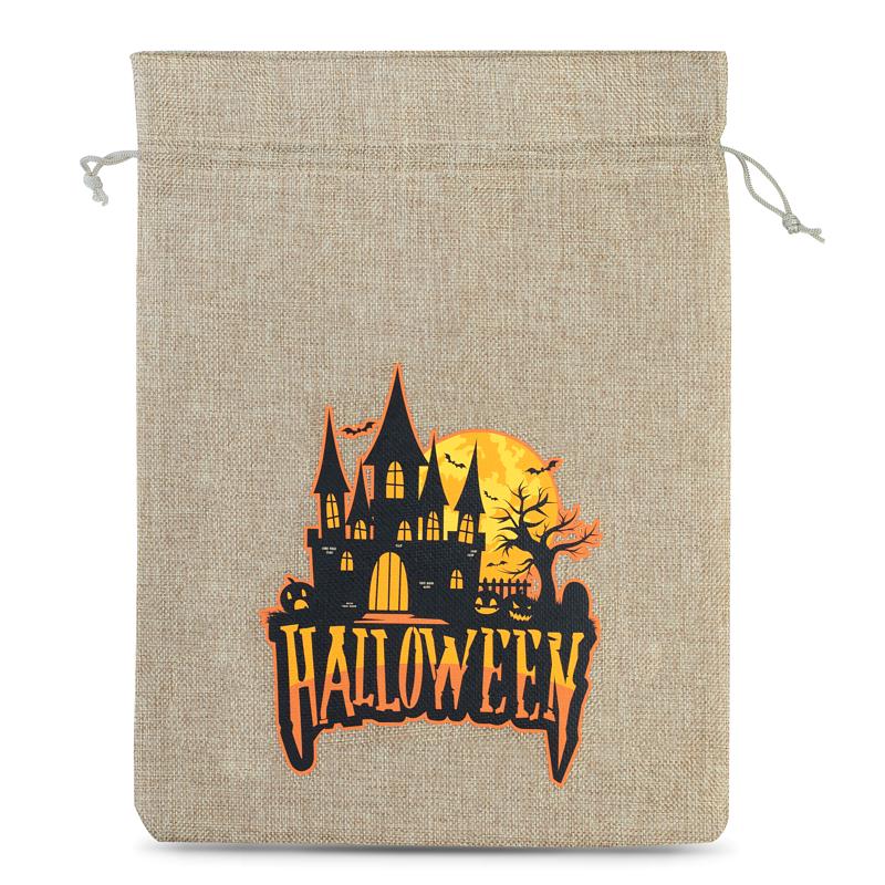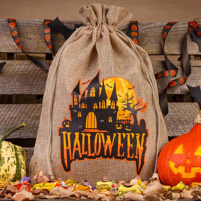 Grote unieke zak van jute, in formaat 30 x 40 cm. De aangeboden tas heeft een elegante natuurlijke kleur kleur en een bedrukking met een Halloweenmotief.