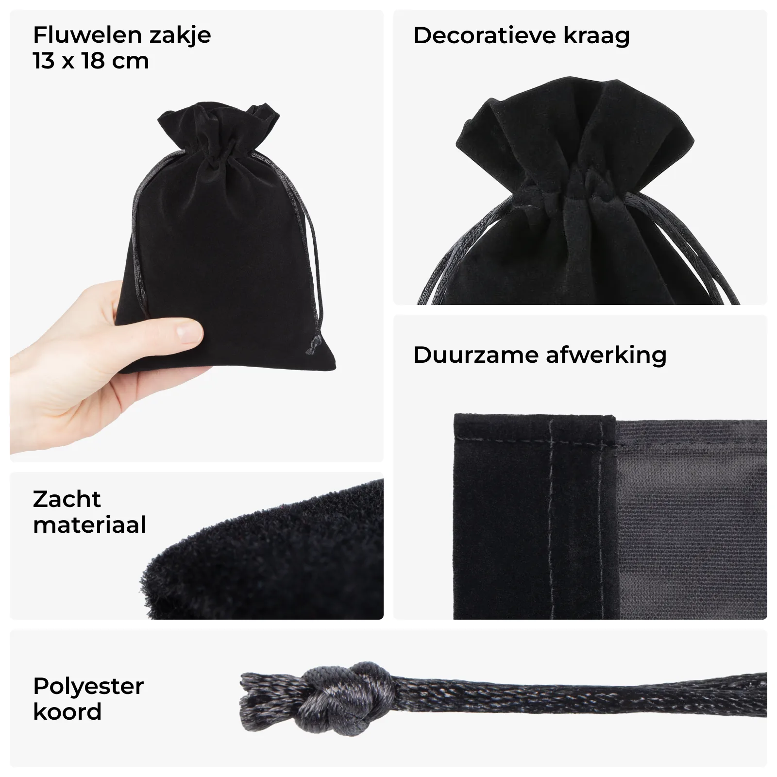 Fluwelen zakjes hebben een luxueuze, elegante uitstraling. De zwarte kleur geeft ze een klassevolle look en maakt ze tot de ideale verpakking voor verschillende gelegenheden. Ze kunnen worden gebruikt voor het inpakken van sieraden, cosmetica of geschenken, waardoor ze een uniek karakter krijgen.