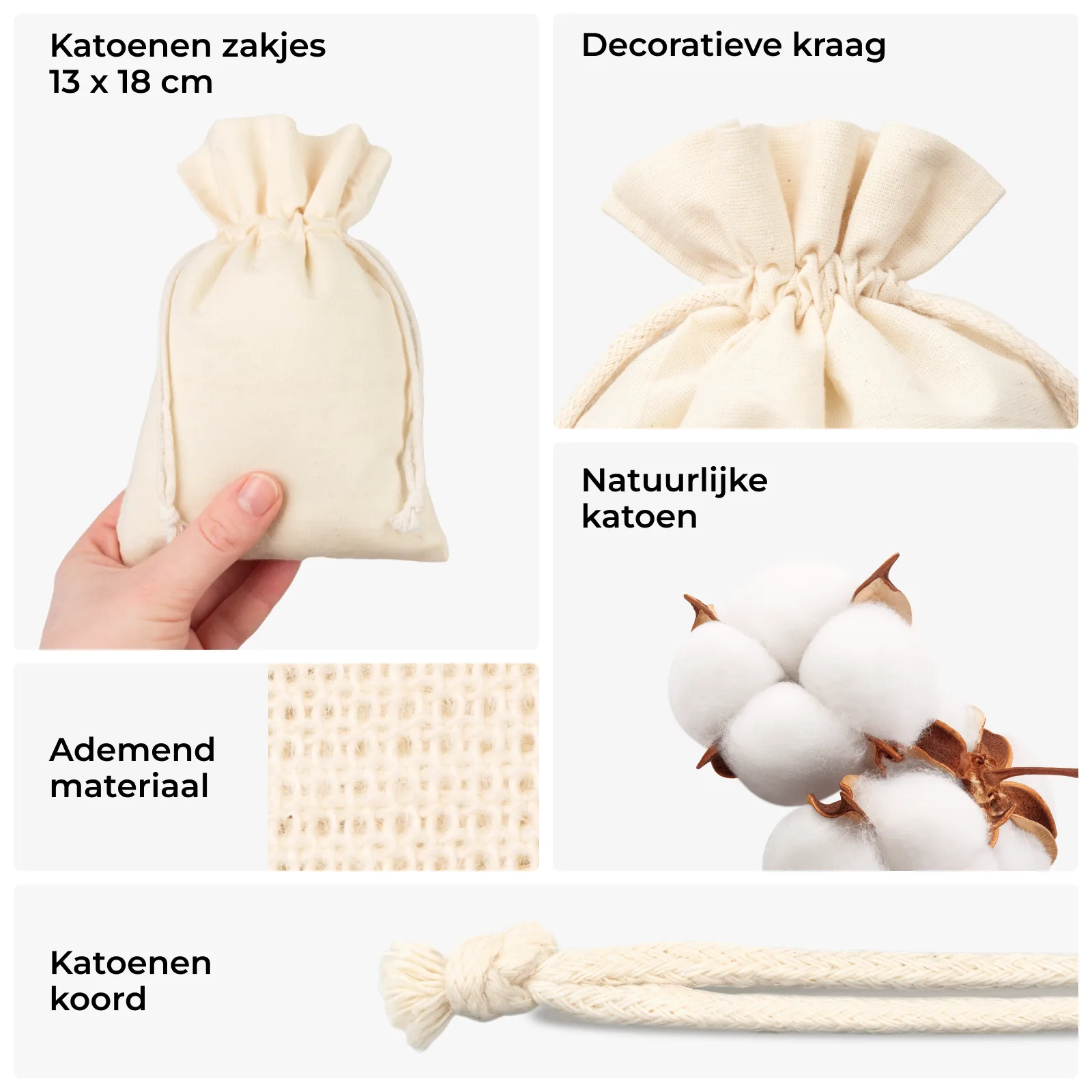 Ben je op zoek naar veelzijdige zakjes om op te bergen en in te pakken? Onze natuurlijke katoenen zakjes (13 x 18 cm) zijn perfect: de set bevat 10 stuks. Deze zakjes zijn ideaal voor thuis en op reis. Het sterke katoen is geschikt voor sieraden, handgemaakte producten, kantoorbenodigdheden, hygiëneproducten, elektronica of cosmetica. Onze katoenen zakjes houden je rugzak of tas netjes georganiseerd!