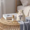 De zakjes zijn gemaakt van 100% katoen in een natuurlijke kleur. De stof heeft een aangenaam, licht ruwer oppervlak, laat lucht goed door en geeft de zakjes het karakter van rustieke katoenen zakjes. De neutrale tint vormt een stijlvol decor voor de paarse print met een lavendelboeket met strik.