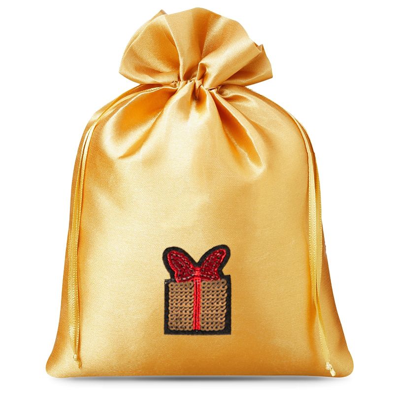 Bestel hier elegante satijnen zakjes in goud - perfect voor Kerstmis. Deze feestelijke verpakkingen zijn versierd met een applicatie van glinsterende pailletten in de vorm van een geschenk met een strik. De zakjes meten 12 x 15 cm en hebben een dubbel gouden lint in de boord.