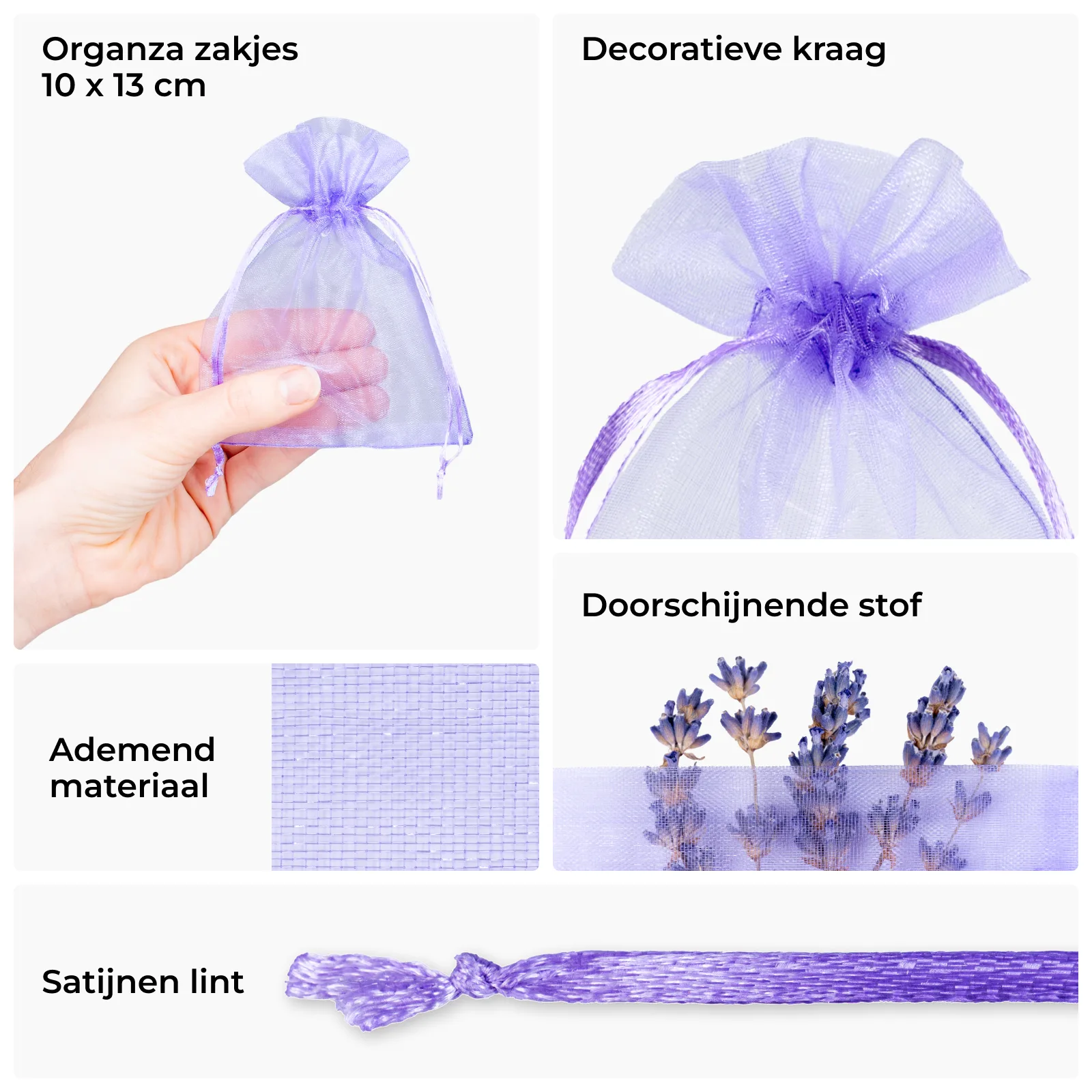 Organza zakjes voor gedroogde lavendel in het formaat 10 x 13 cm zijn elegante, praktische en herbruikbare verpakkingen die ongeveer 20 g gedroogde lavendelbloemen kunnen bevatten. De set bestaat uit 25 paarse zakjes van organza met een subtiel en elegant uiterlijk, voorzien van een decoratieve kraag boven het trekkoord en een dubbel satijnen lint om te sluiten.