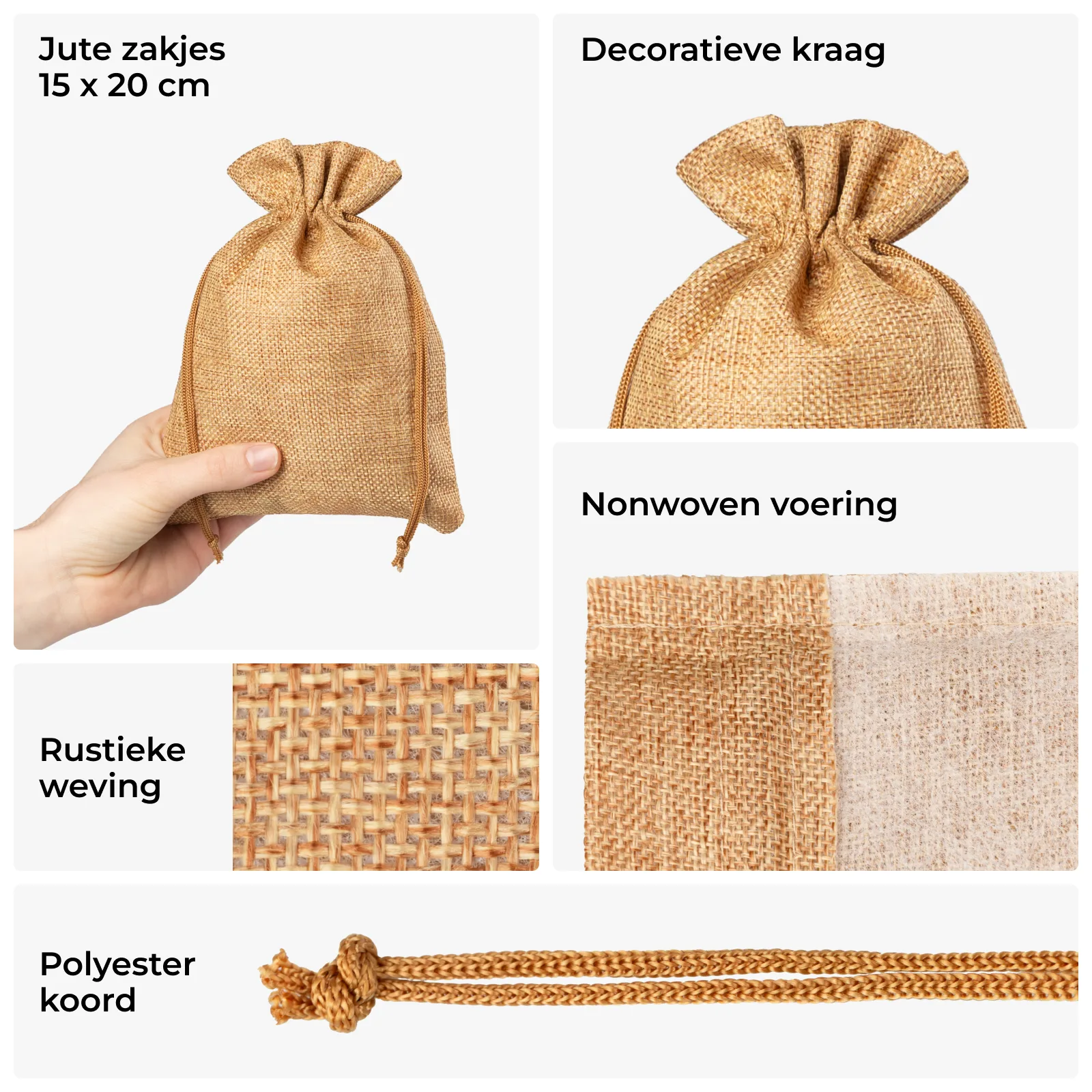 5 stuks jutezakjes in de kleur lichtbruin in het formaat 15 x 20 cm. De door ons aangeboden zakjes zijn vervaardigd van natuurlijke of synthetische jute, die gekenmerkt wordt door sterkte en het karakteristieke "touwtjesuitzicht". Beide stofzakjes absorberen vocht en geven vocht af, daarom verdragen ze goed variërende omgevingsomstandigheden.