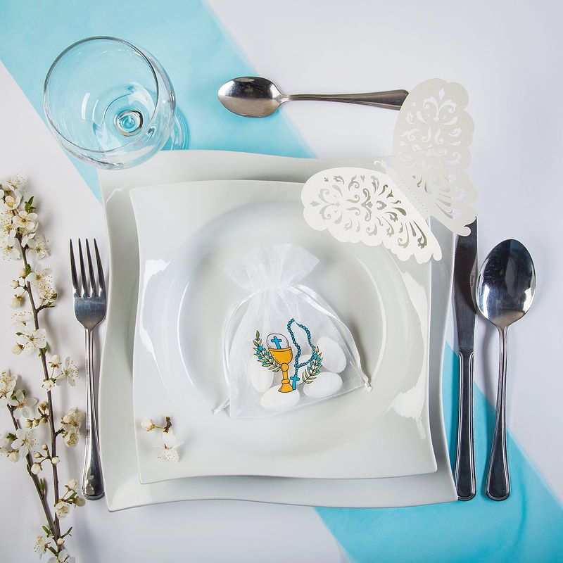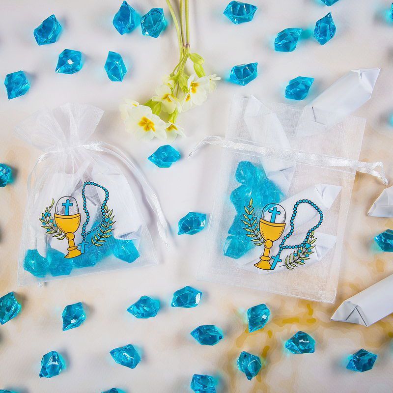 Ben je op zoek naar een elegante verpakking om uw gasten te bedanken tijdens de Communie? Bestel dan onze stoffen organza kadozakjes in wit met een decoratieve opdruk voor de Eerste Heilige Communie. De hier aangeboden kleine cadeauzakjes meten 10 x 13 cm en zijn versierd met een print die de hostie in de kelk en een blauwe rozenkrans voorstelt. Een set bestaat uit 5 stuks organza zakjes in wit.