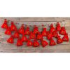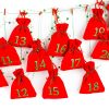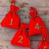 Een adventskalender gemaakt van velours zakjes met afmeting 12 x 15 cm in rode kleur en met een set noodzakelijke accessoires. De verpakking bevat 24 stuks zakken. Elk zakje is bedrukt met één nummer in groene kleur, van 1 tot 24. Deze prachtige kalender brengt de kerstsfeer in Uw huis en maakt het aftellen naar Kerstmis nog aangenamer.