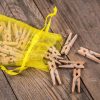 Adventskalender van zakjes van stof met een jute-uitstraling in grijs, samen met accessoires - nummers voor de zakjes in de vorm van vilten stickers en touw en klemmen om een kerstslinger op te hangen.