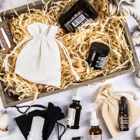 - Jute en linnen: rustiek en natuurlijk - ideaal voor lokale producten, thee, honing of hotelcadeaus.