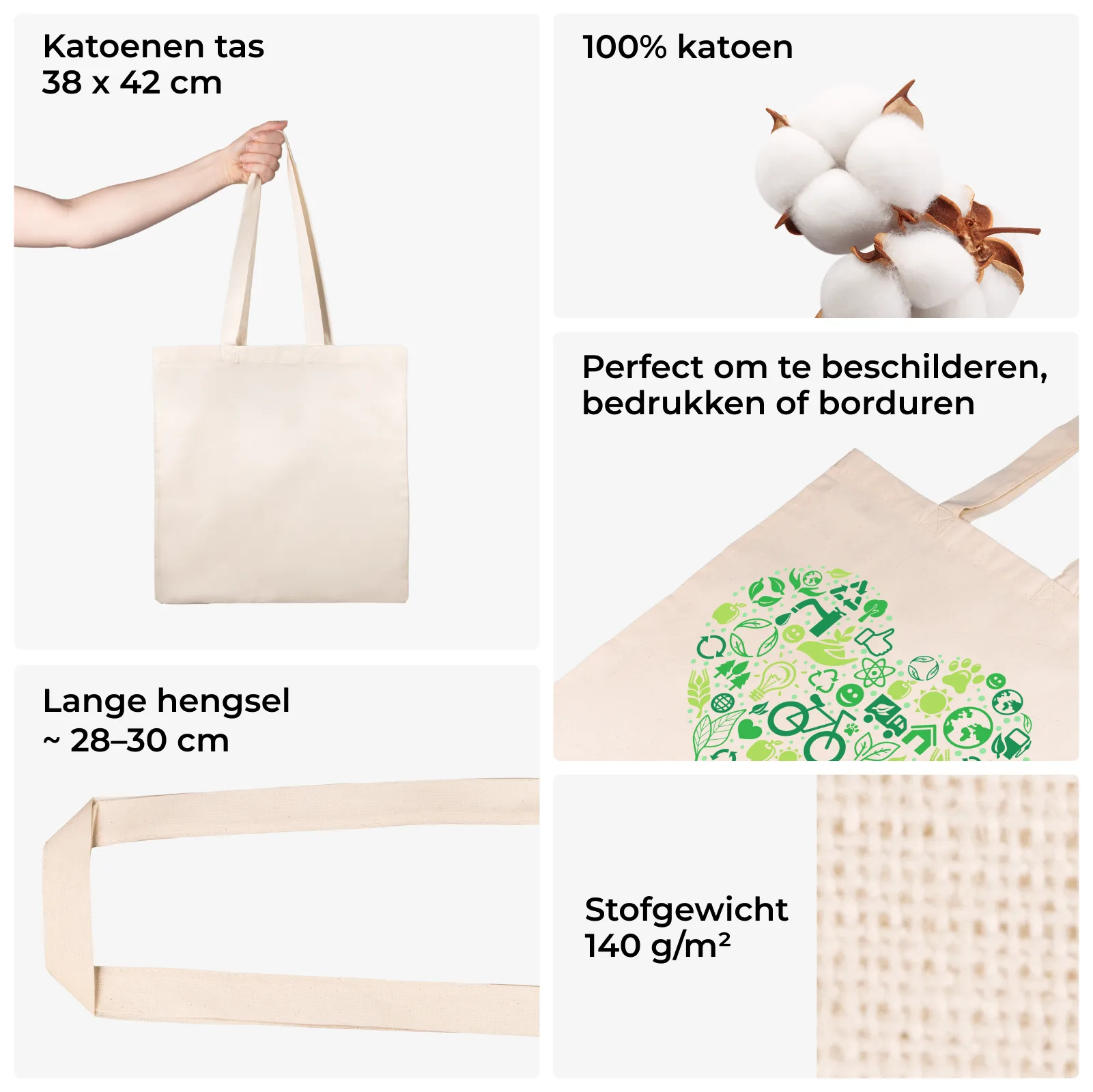 Ontdek onze natuurlijke, onbedrukte eco katoenen tassen in ecru (naturel). Deze tassen zijn genaaid van 100% katoen met een grammatuur van 140g. De tas is geschikt voor een A4-formaat. Katoenen zakken kan u gebruiken op vele manieren! Zij zijn zeer universeel en hebben heel wat opbergcapaciteit. Ze bezitten lange handgrepen, zodat u de tas comfortabel kunt dragen en ook over uw schouder kunt hangen. U zult merken dat deze grote katoenen tassen perfect zijn voor het dagelijks leven! Gebruik ze bij het winkelen of gebruik ze om thuis of op reis allerlei dingen in op te bergen. U kunt deze duurzame, milieuvriendelijke katoenen verpakkingen ook gebruiken als eco geschenk- of productverpakking!