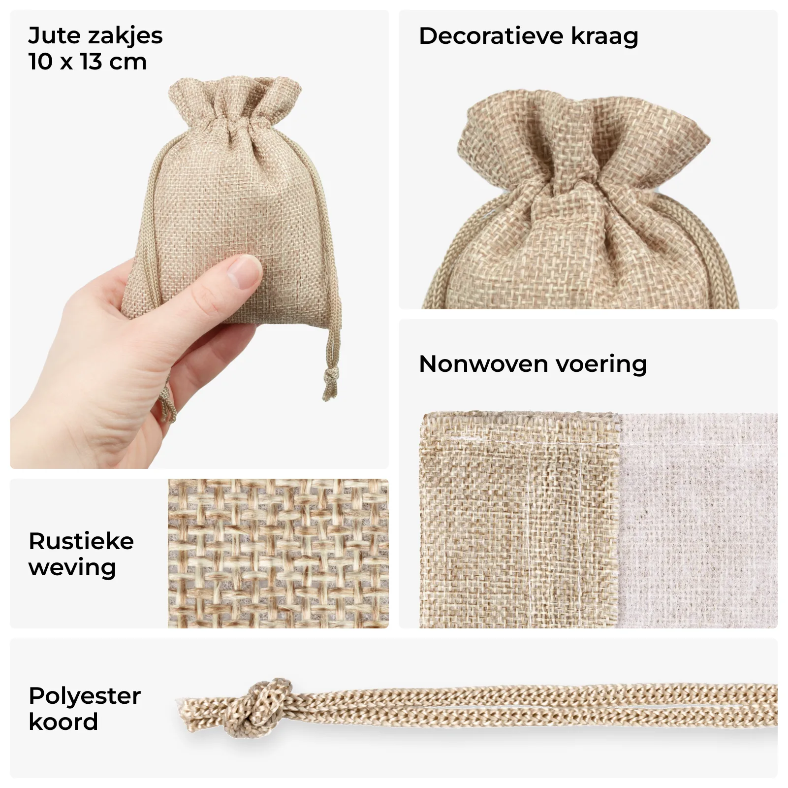 De kleine jute zakjes 10 x 13 vinden een breed scala aan toepassingen in huizen, kantoren en onderweg. Deze zakjes worden niet alleen gebruikt om kleine voorwerpen in op te bergen, maar kunnen ook worden gebruikt om bloempotten te versieren met bloemen of om geurige zakjes met gedroogde kruiden te maken. De kleine jute zakjes zijn ook ideaal als geschenken voor bruilofts- of communie gasten. Je kunt er kleine geschenken in doen, zoals snoepjes of handgemaakte zeepjes, en dankzij de personalisatieoptie kun je jute zakjes bestellen met elke gewenste opdruk, zoals de trouwdatum en jullie namen.