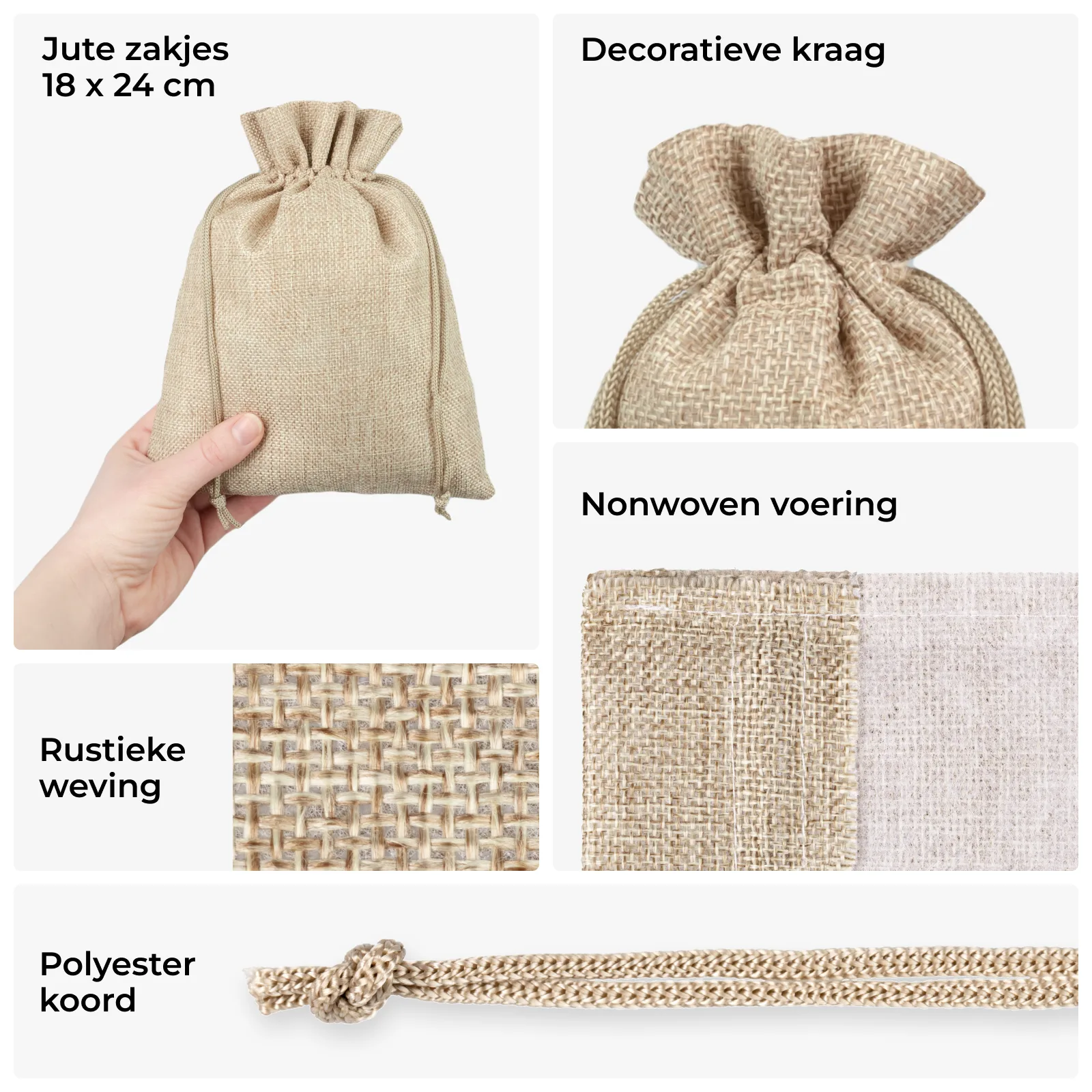 Hoge kwaliteit en duurzaamheid Onze zakjes zijn gemaakt van hoogwaardige jute, wat hun duurzaamheid en esthetische uiterlijk garandeert voor een lange tijd.