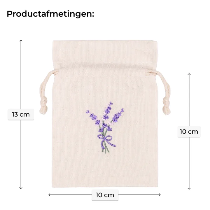 De beste keuze zijn katoenen lavendelzakjes van 10x13 cm met lavendelborduursel - ademend, elegant en klaar voor geurige vulling.