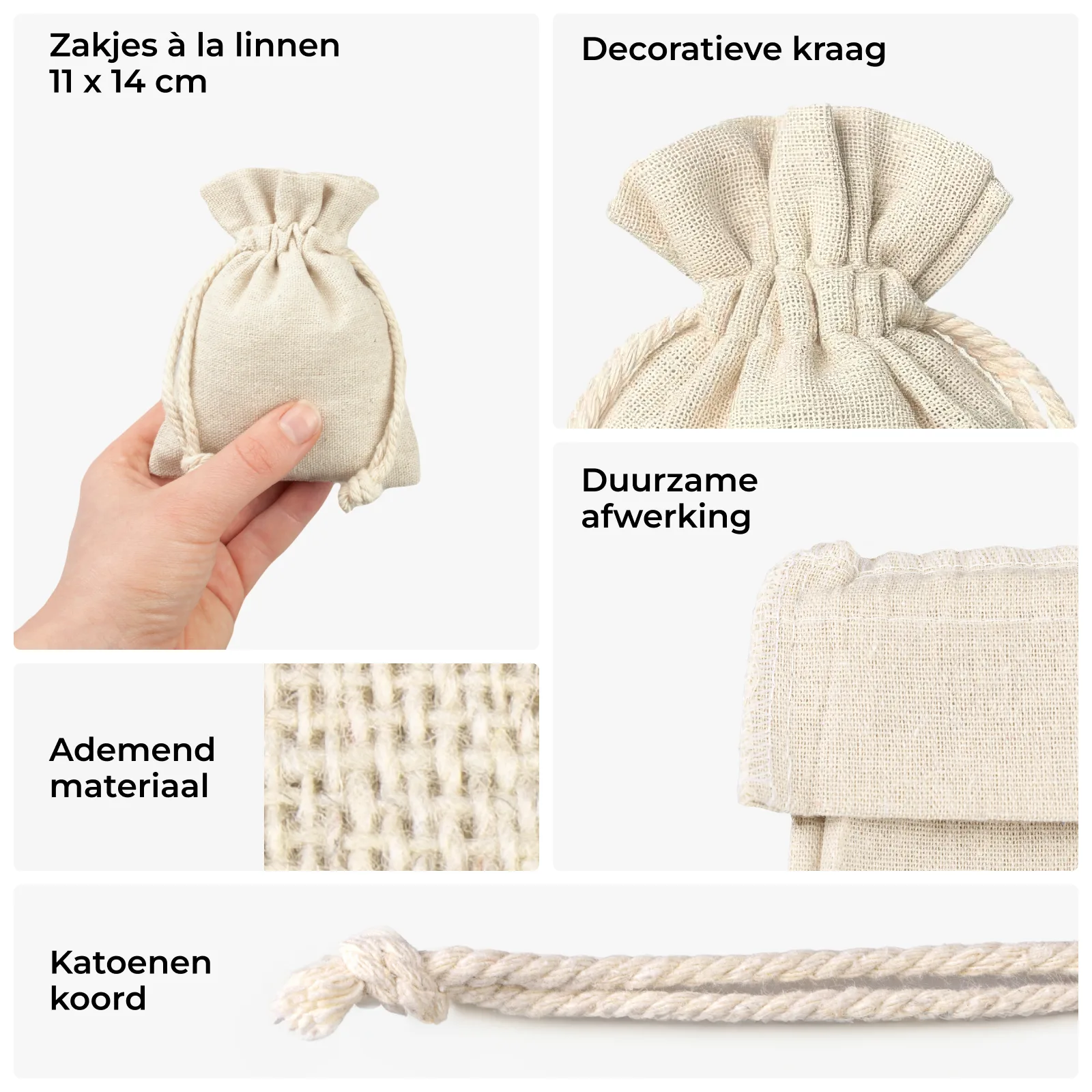 Ontdek onze duurzame en praktische stoffen zakjes à la linnen in een kleur van natuurlijk linnen. De hier voorgestelde zakjes meten 11 x 14 cm. De verpakking bevat een set van 10 universele zakjes.
