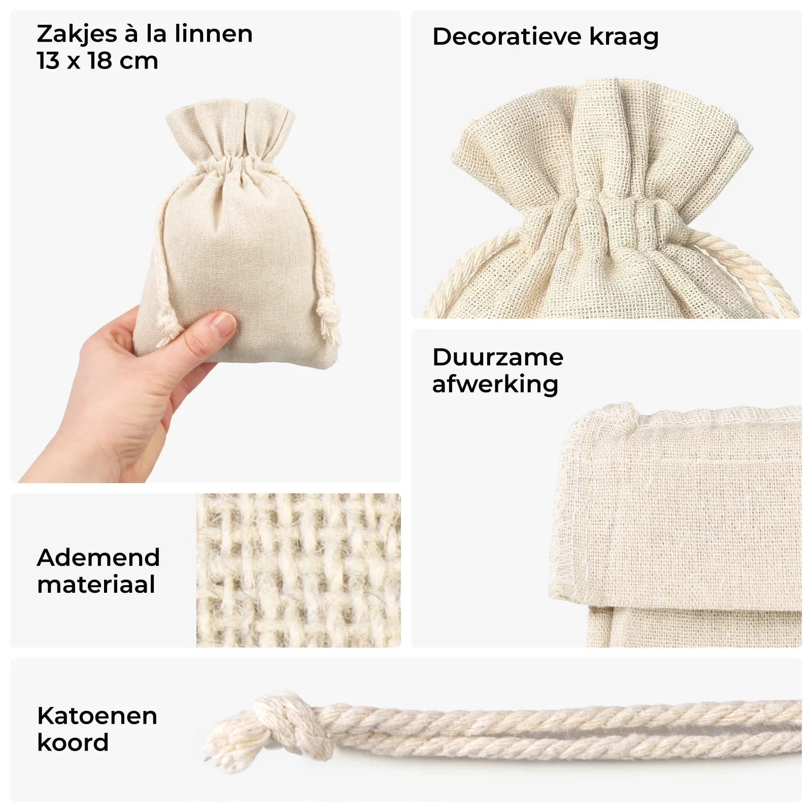 Ontdek onze duurzame en praktische stoffen zakjes à la linnen in een kleur van natuurlijk linnen. De hier voorgestelde zakjes meten 13 x 18 cm. De verpakking bevat een set van 10 universele zakjes.