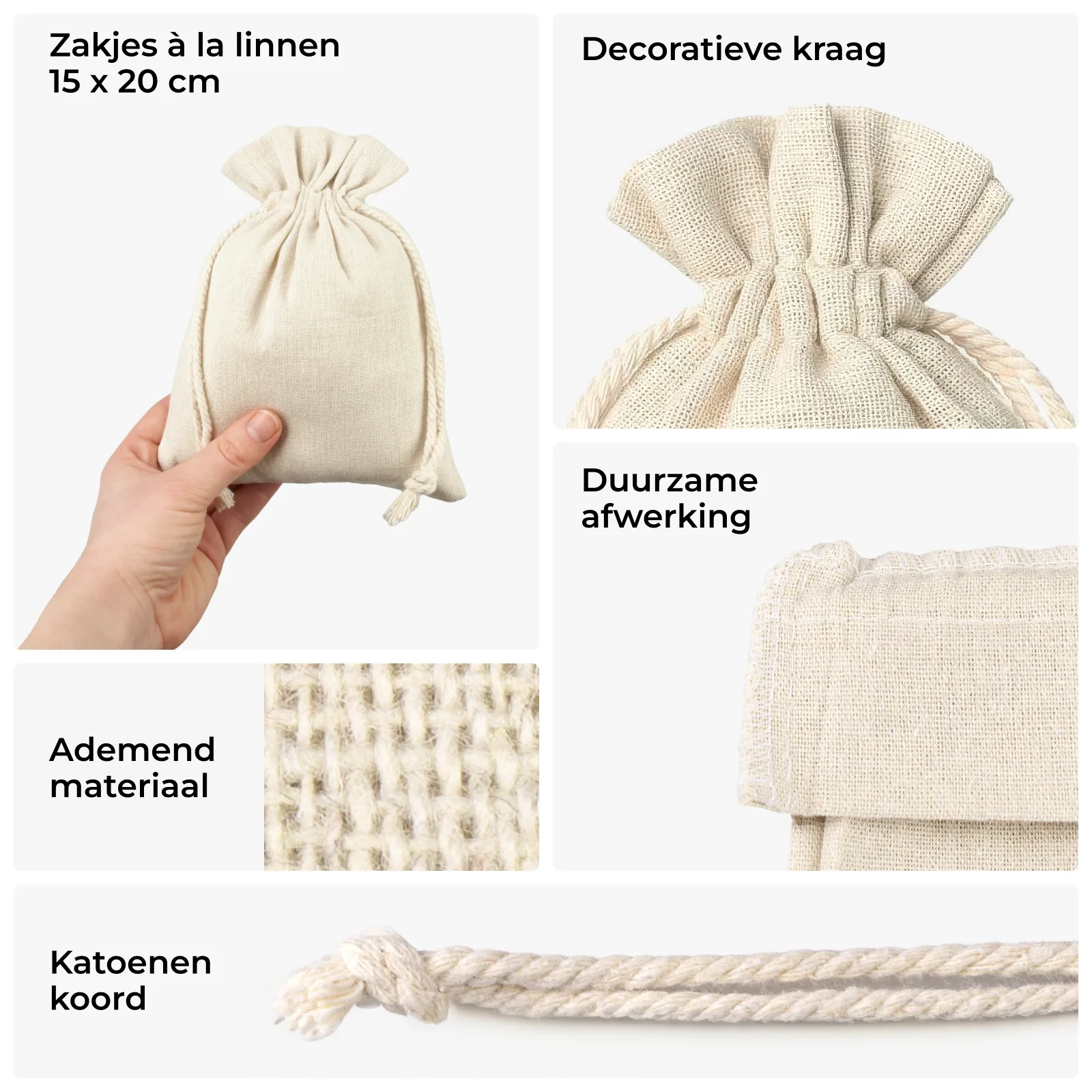 Dankzij het eenvoudige bevestigingssysteem zijn kleine linnen zakjes zeer gemakkelijk te gebruiken. Het ingebouwde katoenen trekkoord kan meerdere keren worden aangetrokken zonder risico op slijtage. U kunt het natuurlijk linnenkleurige zakje gebruiken als organizer voor uw handtas, als hoes voor een plantenpot of als zakje voor kleine elektronica (bijv. oordopjes, oplader, kabels). Linnen zakjes zijn ook geschikt voor sieraden en andere huishoudelijke prullaria. De set bevat 5 stuks.
