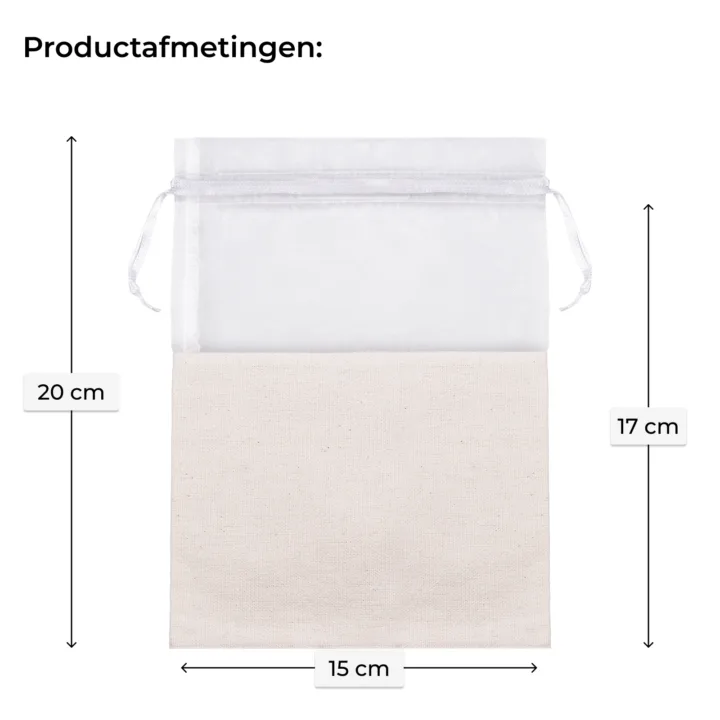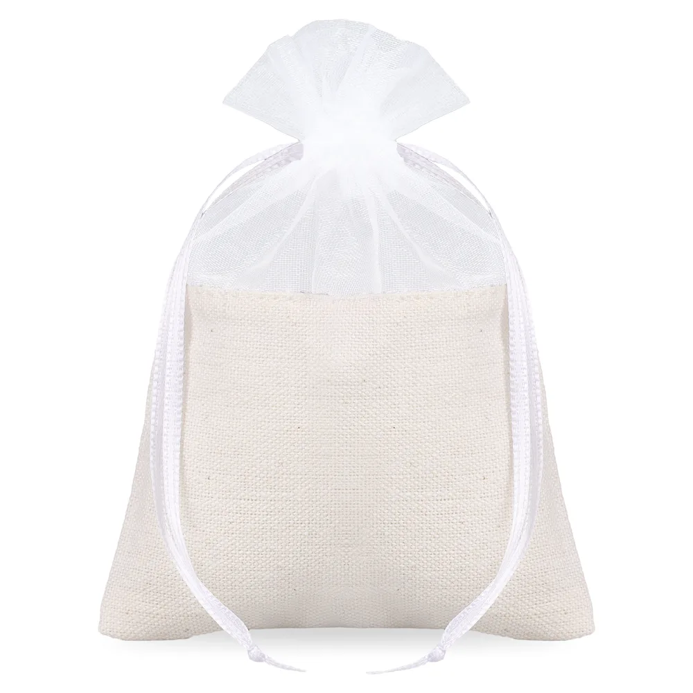 Deze elegante zakjes combineren de natuurlijke uitstraling van linnen met de luchtigheid van transparante organza. Gemaakt van een katoen-polyester mix met linnenlook en fijne organza, bieden ze een duurzame en visueel aantrekkelijke verpakking voor onder meer lavendel, cosmetica, ambachtelijke producten of geschenken.