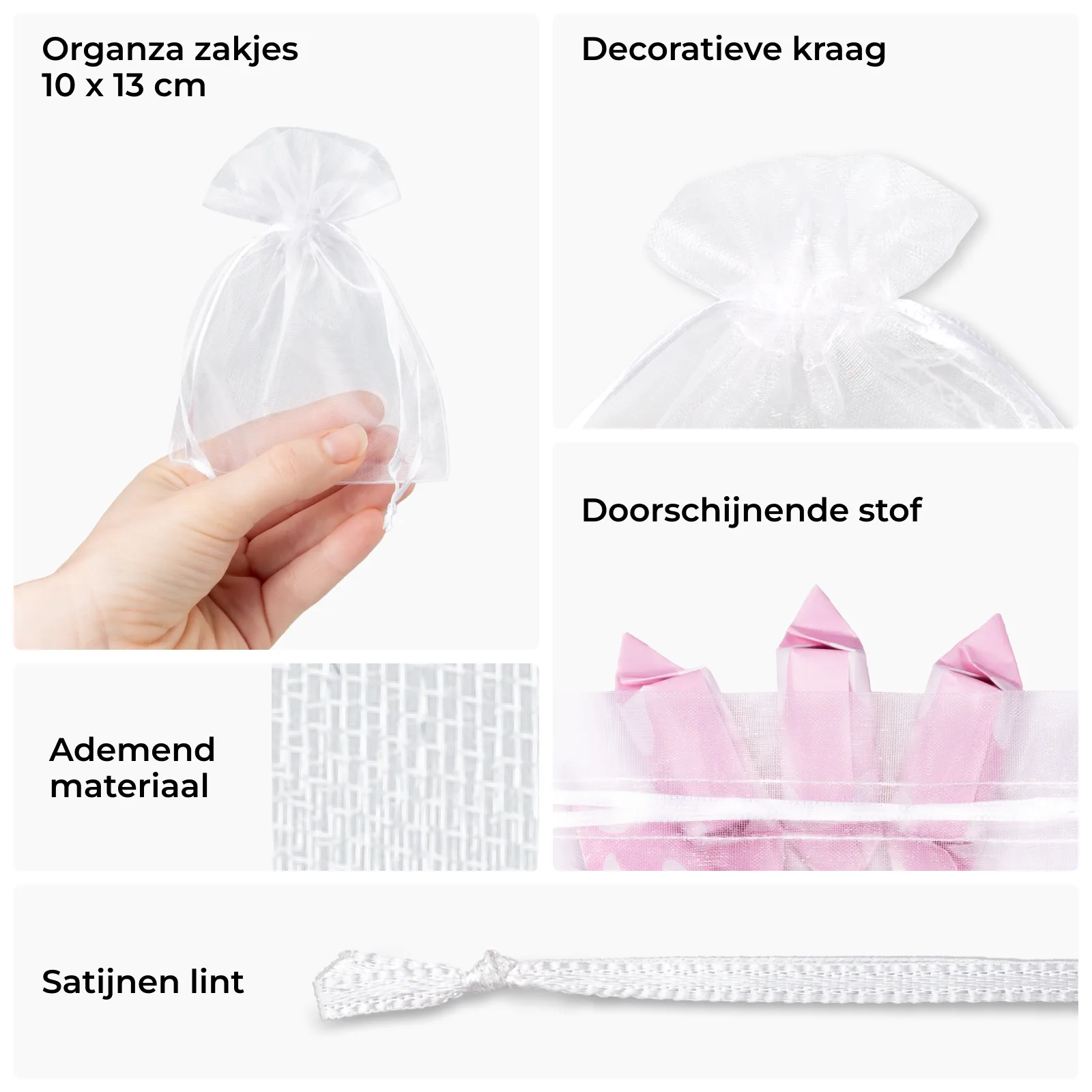 Een praktisch pakket van kleine organzazakjes in de kleur wit. De afmetingen van eenenkel zakje zijn 10 x 13 cm terwijl de hele set bestaat uit 25 stuks. Zo'n hoeveelheid garandeert dat er elke collectie in opgeborgen kan worden.