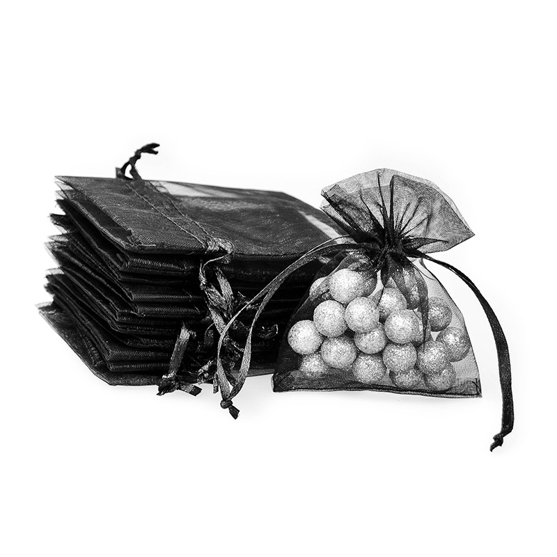 Een praktisch pakket van kleine organzazakjes in de kleur zwart. De afmetingen van eenenkel zakje zijn 10 x 13 cm terwijl de hele set bestaat uit 25 stuks. Zo'n hoeveelheid garandeert dat er elke collectie in opgeborgen kan worden.