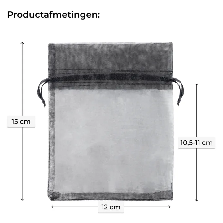 Onze zwarte organza zakjes van 12 x 15 cm zijn de perfecte combinatie van esthetiek en functionaliteit. Dankzij de mogelijkheid tot personalisatie, de hoge kwaliteit van de afwerking en de veelzijdige toepassing, zijn ze de perfecte oplossing voor zowel particuliere als zakelijke klanten. Door te kiezen voor onze zakjes, krijg je een elegant en praktisch pakket dat de waarde van je producten onderstreept en een onvergetelijke indruk achterlaat bij je klanten.