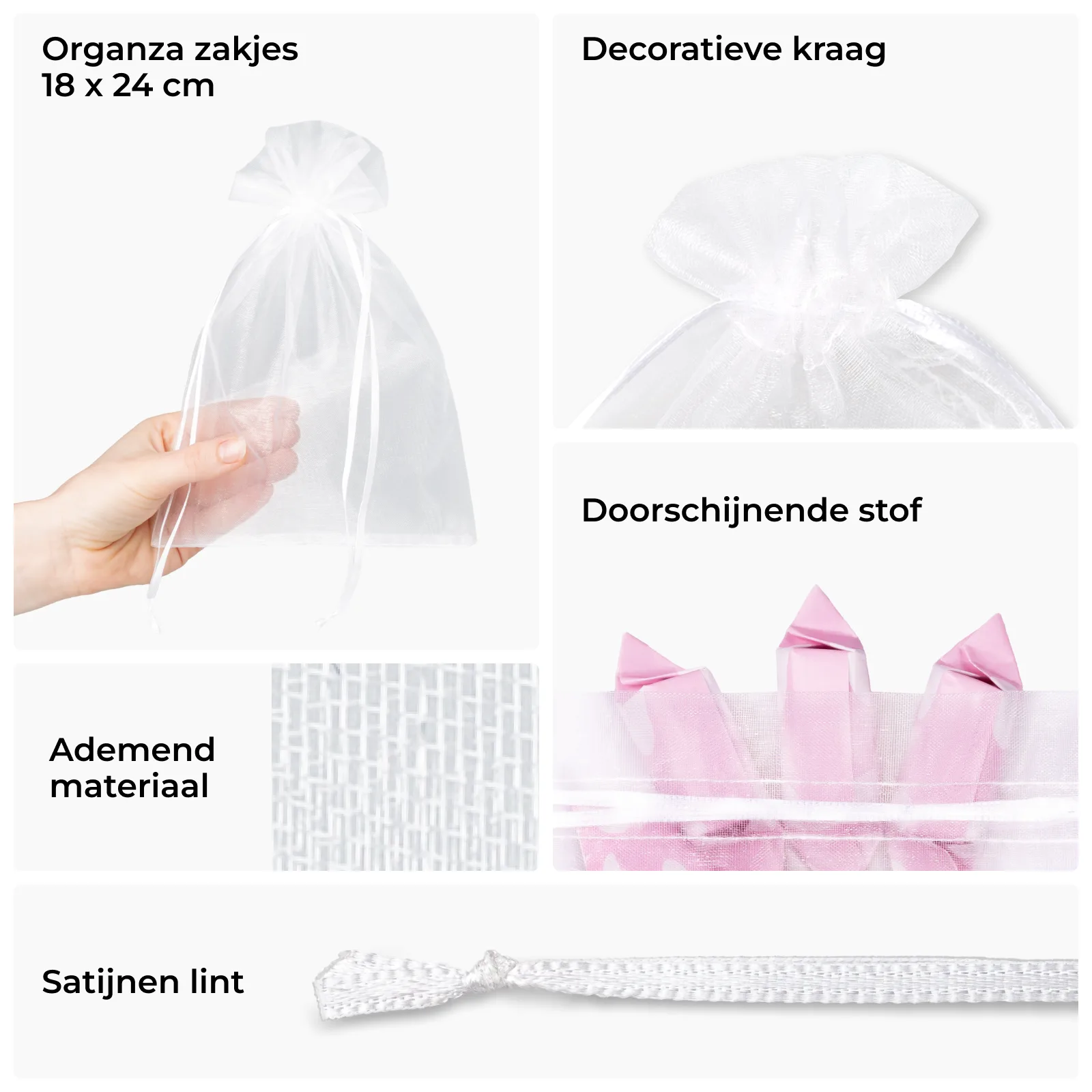 De set bevat 10 stuks organza zakjes, elk met een afmeting van 18 x 24 cm, in de kleur wit. Witte zakjes zijn veelzijdige producten die kunnen worden gebruikt om diverse items te presenteren. Ze zijn uitstekend als transparante verpakking voor sieraden, handgemaakte zepen, briefpapier, souvenirfiguurtjes, promotionele geschenken, of monsters van cosmetica en parfums. Vanwege hun delicate kleur worden witte organza zakjes ook vaak gebruikt voor het klaarmaken van kleine geschenken voor bruilofts- of communiegasten.